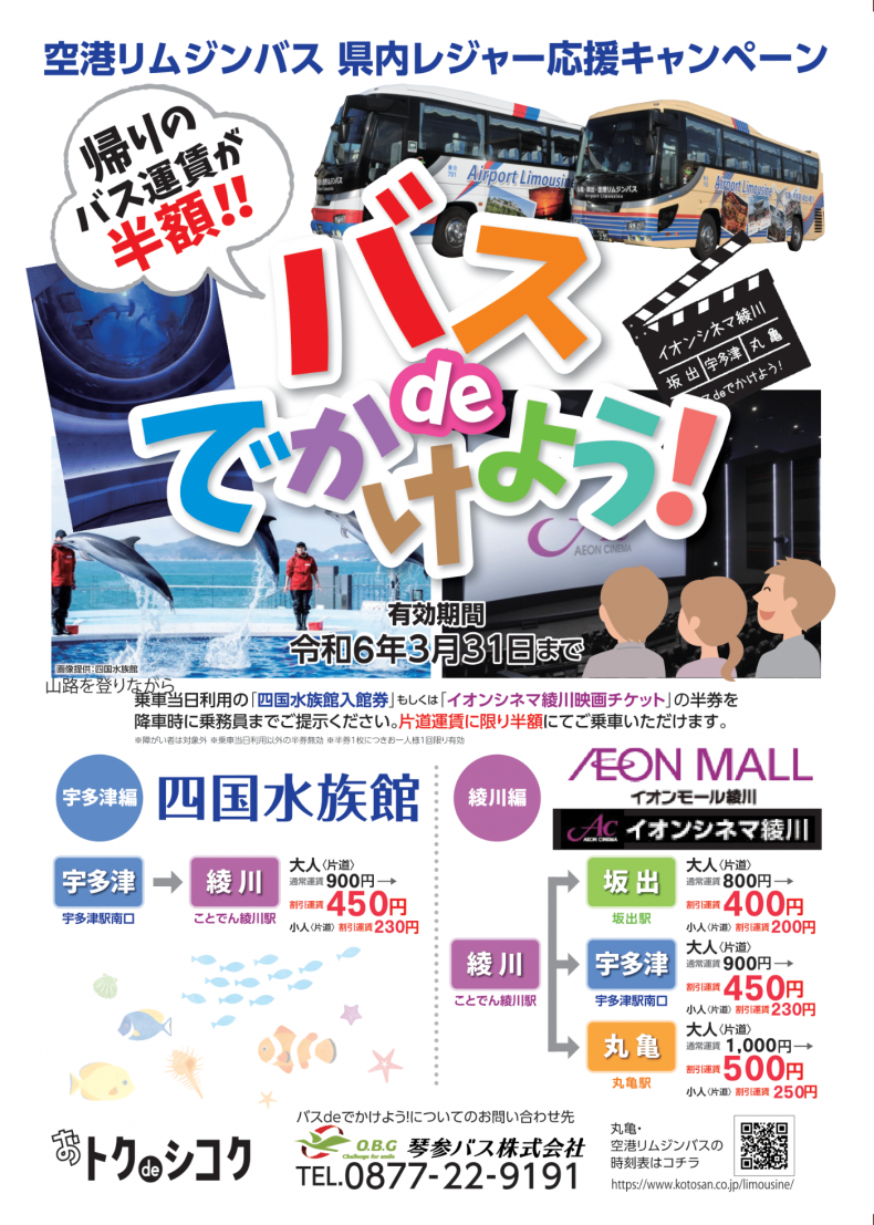 乗車当日に利用した「四国水族館入館券」もしくは「イオンシネマ綾川映画チケット」の半券を降車時に乗務員までご提示いただくと、片道運賃に限り半額でご乗車いただけます!