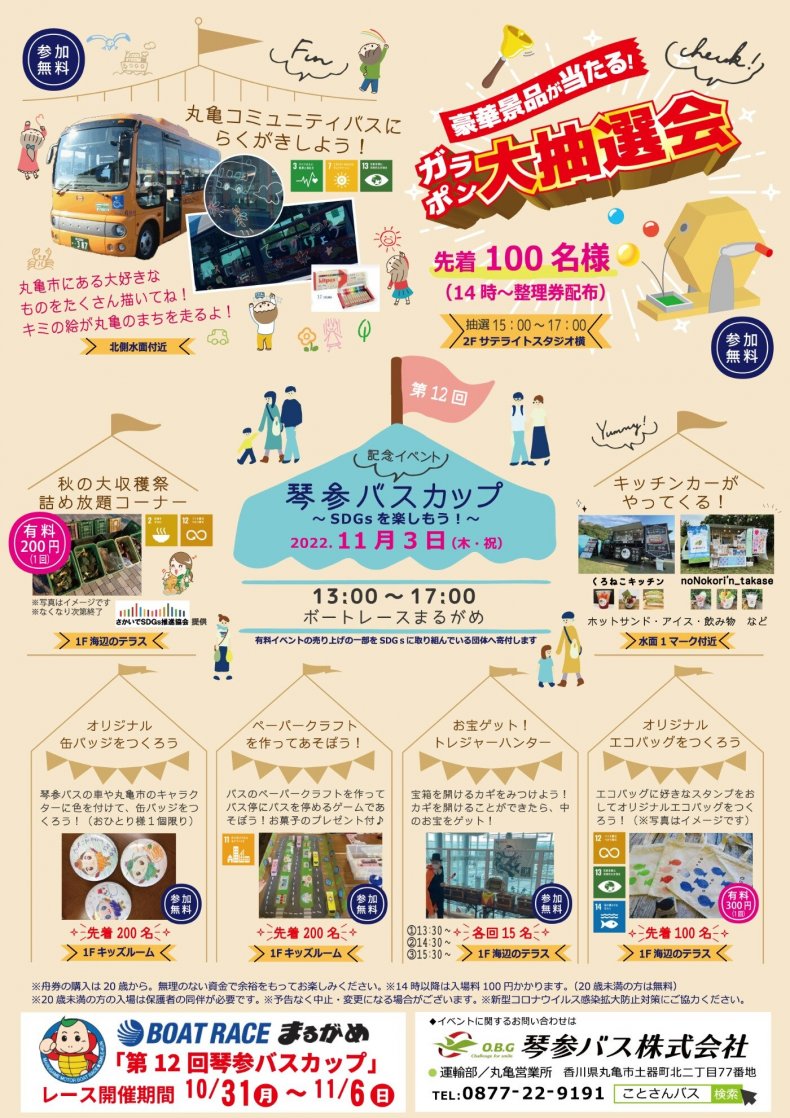 今回は開催場所であるボートレース丸亀と連携し環境にやさしい公共交通の利用促進やプラスチックゴミ等の削減などイベントを通じて「SDGsを楽しもう」をテーマにふれあいながら知ってもらう企画となっておりますので是非、ボートレース丸亀へお越しください。