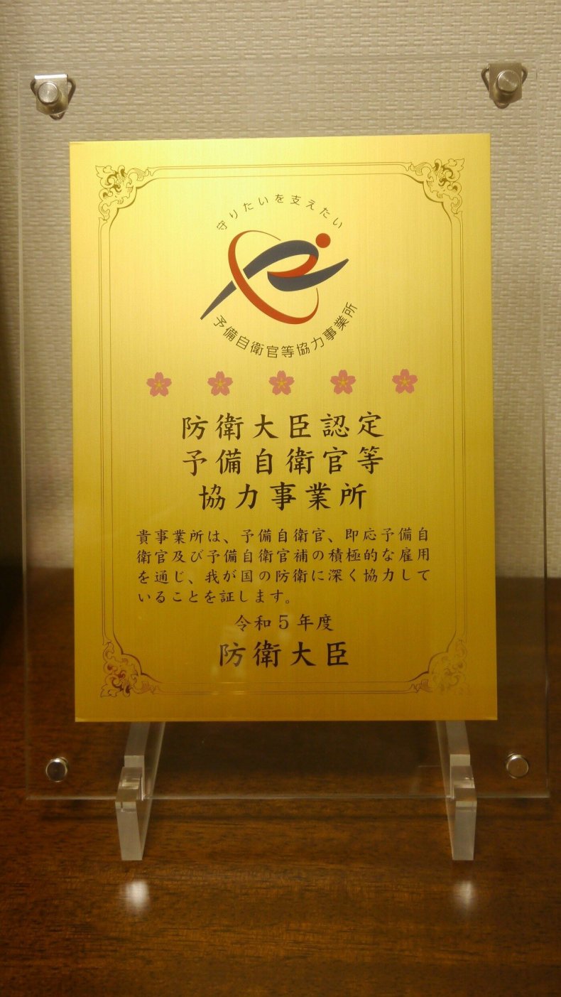2024年06月03日(月) 採用情報 「予備自衛官等協力事業所」の防衛大臣認定 このたび弊社が長年、予備自衛官等を雇用し社会貢献を果たしていることが防衛省に認められ、防衛大臣より「予備自衛官等協力事業所」の認定を受けることとなりました。 「このまちの 笑顔のために 挑戦する」というグループ理念の弊社としては、大変光栄なことであり、今後も訓練に参加しやすい環境を整えるなど、その活動を支援してまいります。