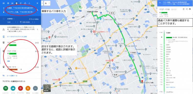 2021年06月23日(水) 路線バス Googleマップで坂出路線バスの経路検索が可能になりました。 当社では丸亀コミュニティバスに続き、Google乗換案内に坂出路線バス情報の登録・提供を開始しました。 これにより6月22日からGoogleマップ上に坂出路線バスの情報が表示されるようになり、 経路検索において目的地までのバス時刻や運賃が検索できるようになりました。 簡単に運行経路や時刻等が調べられますので、ぜひご利用ください。