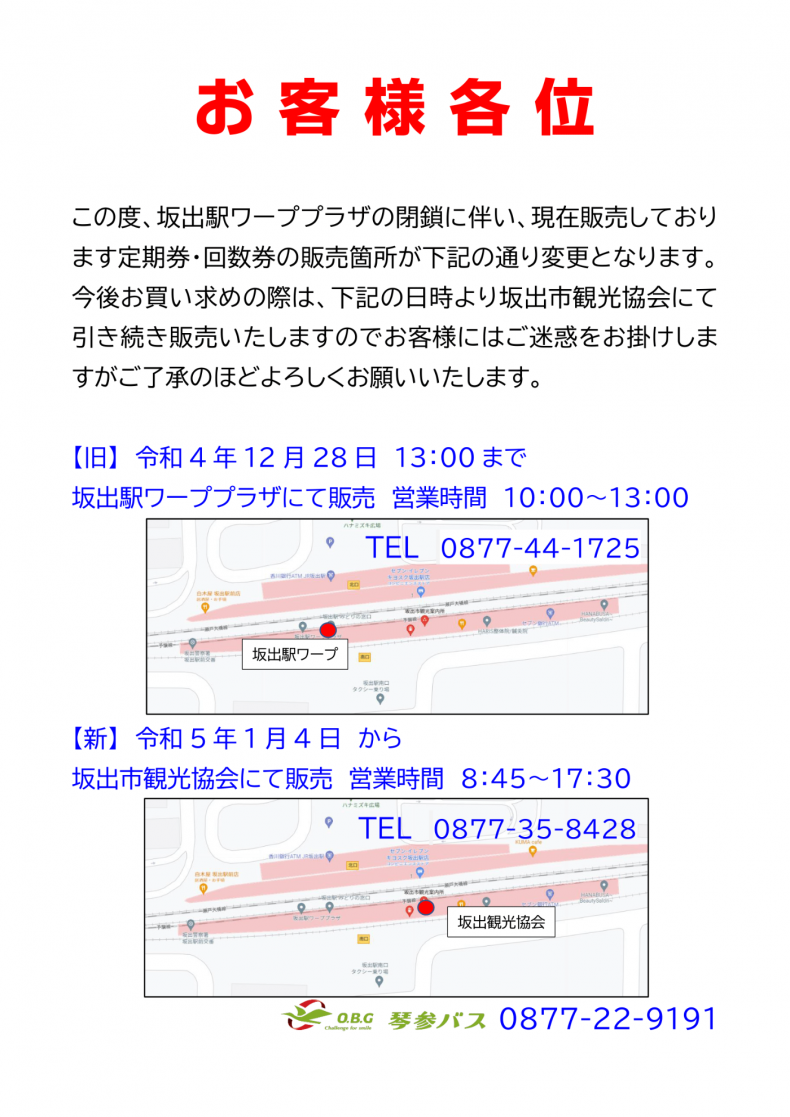 この度、坂出駅ワーププラザの閉鎖に伴い、定期券・回数券の販売場所が坂出市観光協会へと変更となります。
