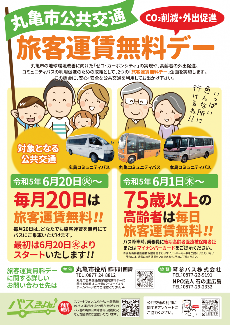 丸亀市の地球環境改善に向けた「ゼロ・カーボンシティ」の実現や、高齢者の外出促進、コミュニティバスの利用促進のための取組として、2つの「旅客運賃無料デー」企画を実施いたします。
